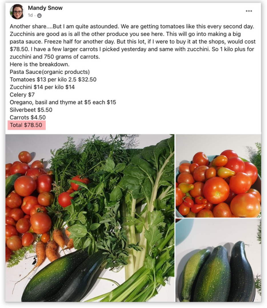She shared a photo of one of her harvests and calculated that if she was to go and buy all this from the organic shop it would have cost her $78.50!