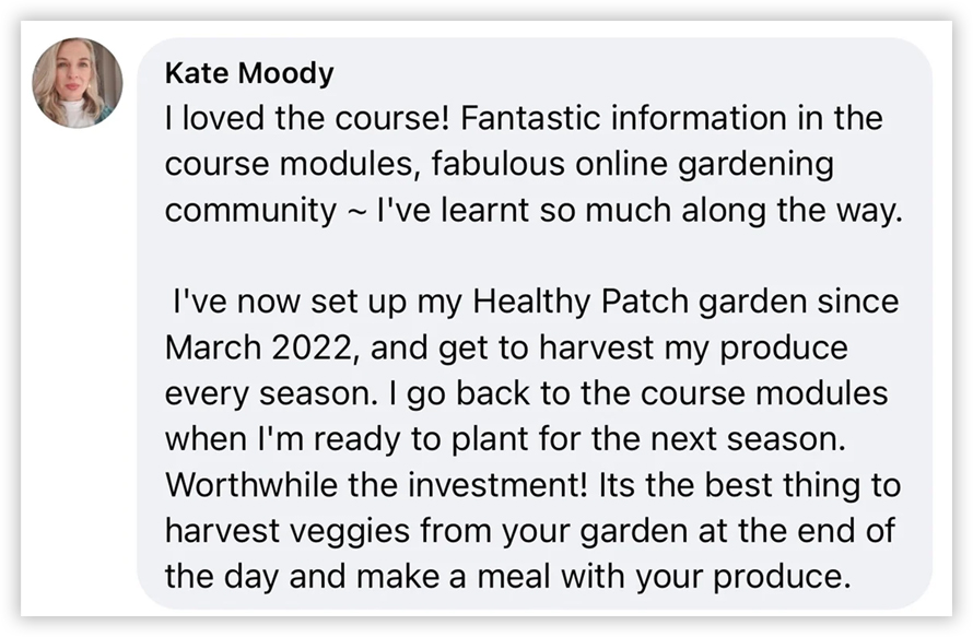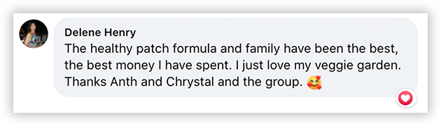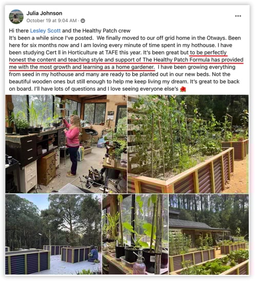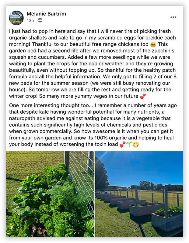 "For anyone wanting to create their own edible garden with amazing produce easily, The Healthy Patch Formula is a must! Go & do it now, you won’t be disappointed!"